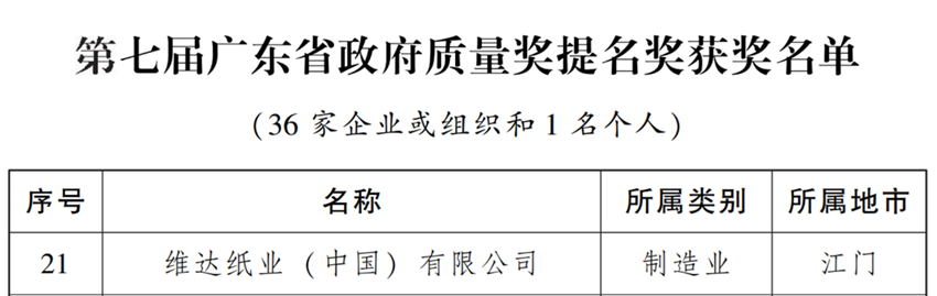 日前,廣東省人民政府官網(wǎng)發(fā)布《關(guān)于表彰第七屆廣東省政府質(zhì)量獎(jiǎng)獲獎(jiǎng)組織和個(gè)人的通報(bào)》,維達(dá)紙業(yè)(中國(guó))有限公司榮獲第七屆廣東省政府質(zhì)量獎(jiǎng)提名獎(jiǎng)。