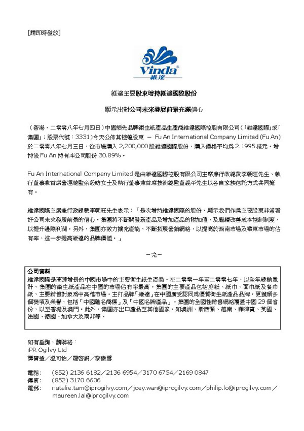 維達主要股東增持維達國際股份,顯示出對公司未來發(fā)展前景充滿信心